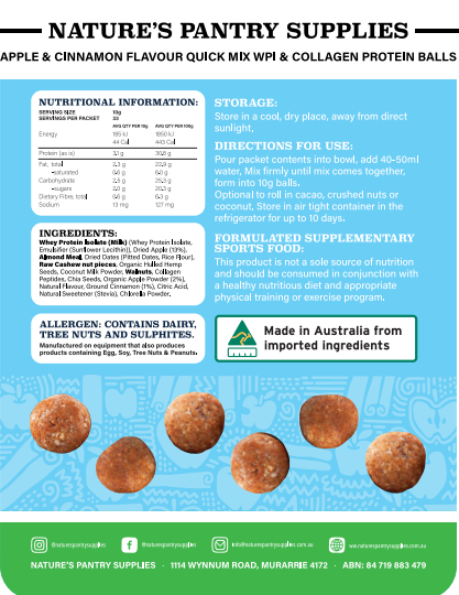 This spectacular Apple and Cinnamon blend of WPI and collagen peptides make a nutritious and convenient snack - just add water! This pack makes 33 balls