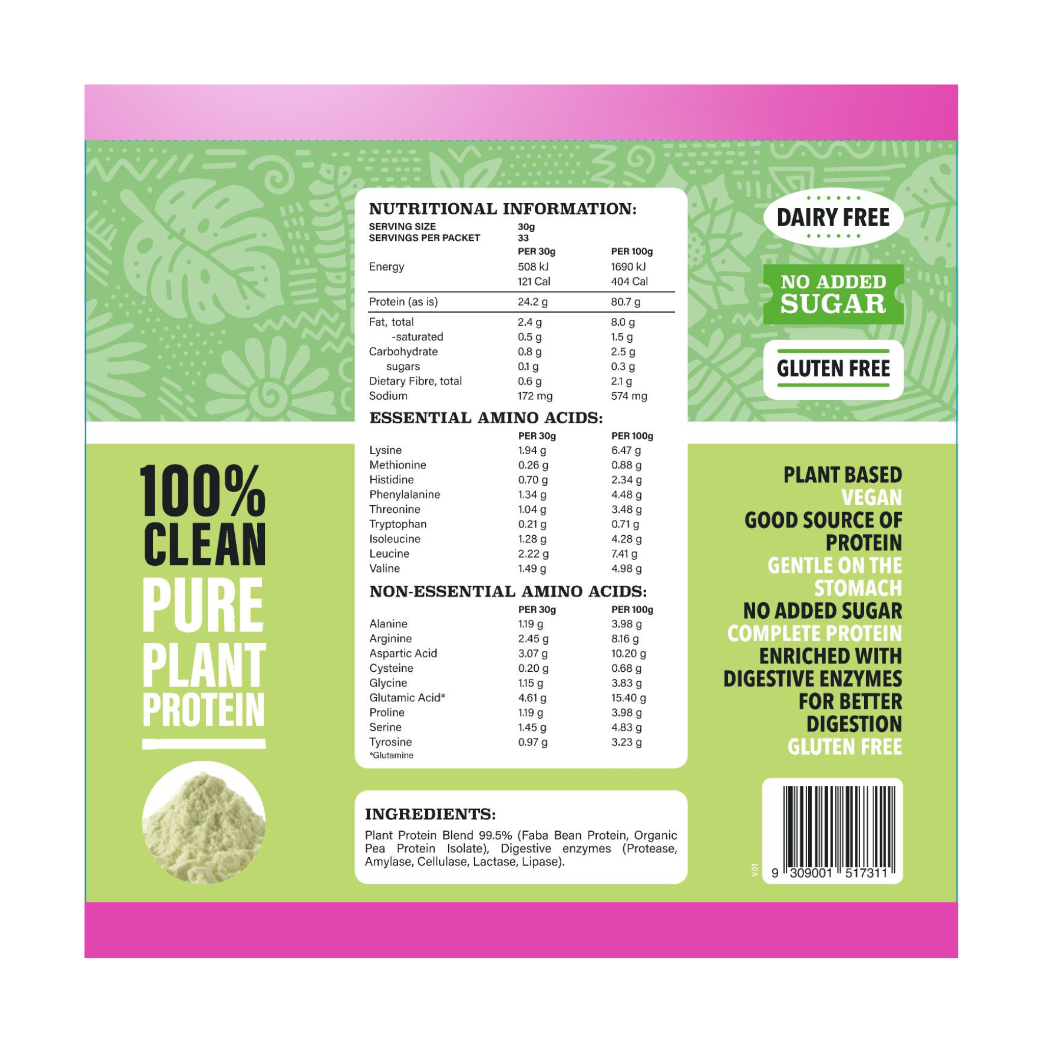 Get ready to embrace the ultimate plant-based protein experience! Our Plant Protein Unflavoured is a pure, no-nonsense blend of pea and faba protein, enhanced with digestive enzymes to support easy absorption and a happy gut. Each serve delivers an impressive 24.2g of high-quality, plant-powered protein—ideal for fuelling your day, your workout, and your life.